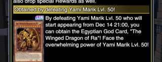 A new skill for Yami Marik, "Power of the Tributed", can be obtained by defeating Yami Marik Lvl 50. A skill that gives The Winged Dragon of Ra the combined Attack points and combined Defense points of the monsters used to tribute summon it.