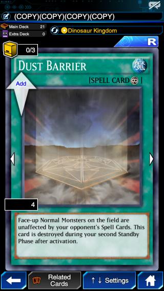 ![]() Dust Barrier | It allows your normal monsters to be unaffected by all spell cards for 2 turns which may be useful since Yami Bakura's Lvl 40 deck consists of monster and spell cards. |